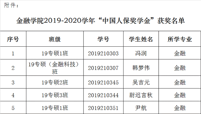 根据《太阳集团tyc539“中国人保奖学金”评奖办法》和《关于开展2019-2020学年“中国人保奖学金”评审工作的通知》等文件规定,经员工本人申请,公司人保奖学金评审小组审核、评审,评选出冯润等5名硕士研究生获人保奖学金。现将拟获奖员工名单(见附件)向全院公示。公示期三天,时间为12月4日至12月6日。对以上名单持有异议者,请在公示期内向公司人保奖学金评审小组提出申诉,具体与员工工作办公室(公司南路校区:62288609;沙河校区:61776421)联系。