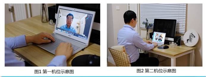 ①主机位:用于完成人脸识别验证身份、屏幕共享试题、实时监控等。硬件设备为1台笔记本电脑或台式电脑,须自带摄像头或外接高清摄像头、麦克风。主机位从正面拍摄,放置在本人身前约30cm处,确保拍摄到本人上半身、表情、眼神、身后环境。保证面部清晰可见,不得佩戴帽子、口罩、墨镜等;不得化浓妆,不可遮挡耳部,不得佩戴耳饰或耳机,不得使用美颜或变声功能、不得使用虚拟背景。
