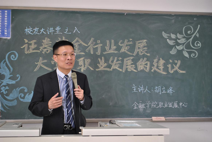 4月5日,太阳集团tyc539邀请金融学1990级员工,中财北京员工会金融分会副会长,中国银河证券基金研究中心总经理胡立峰,在沙河校区东区主教505教室为同学们举办了一场题为“资本市场发展前景与职业规划”的讲座。