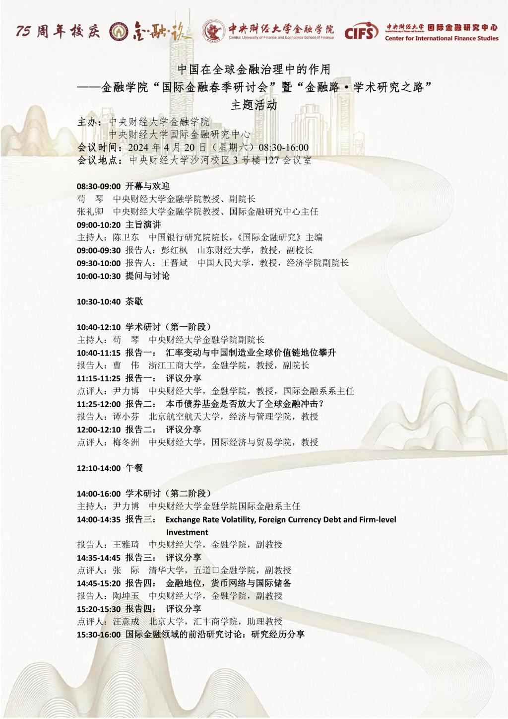 太阳集团tyc539金融学系春季宏观金融研讨会暨“金融路·学术研究之路”主题活动议程