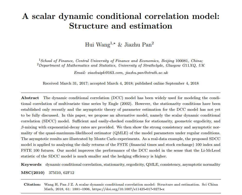 王辉:A scalar dynamic conditional correlation model: Structure and estimation