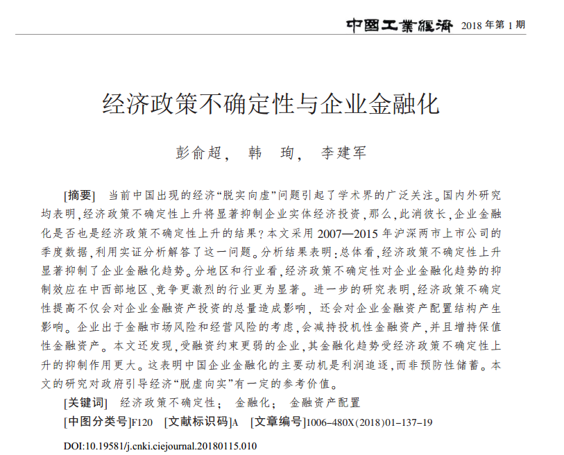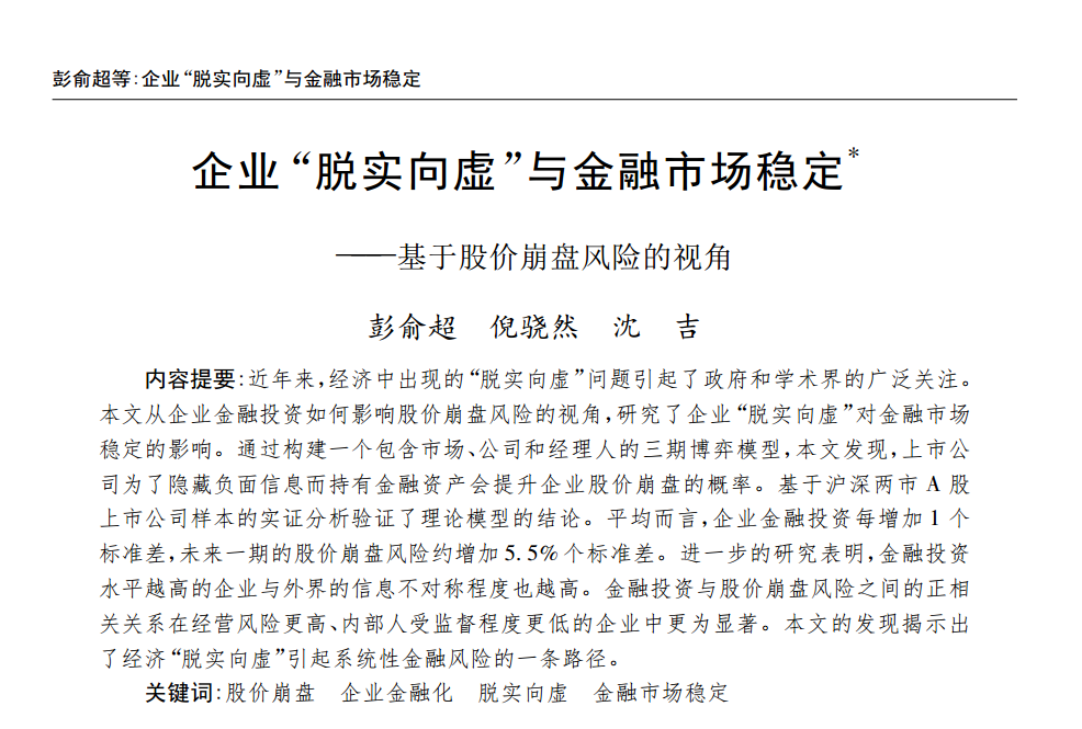 彭俞超:《企业“脱实向虚”与金融市场稳定——基于股价崩盘风险的视角》