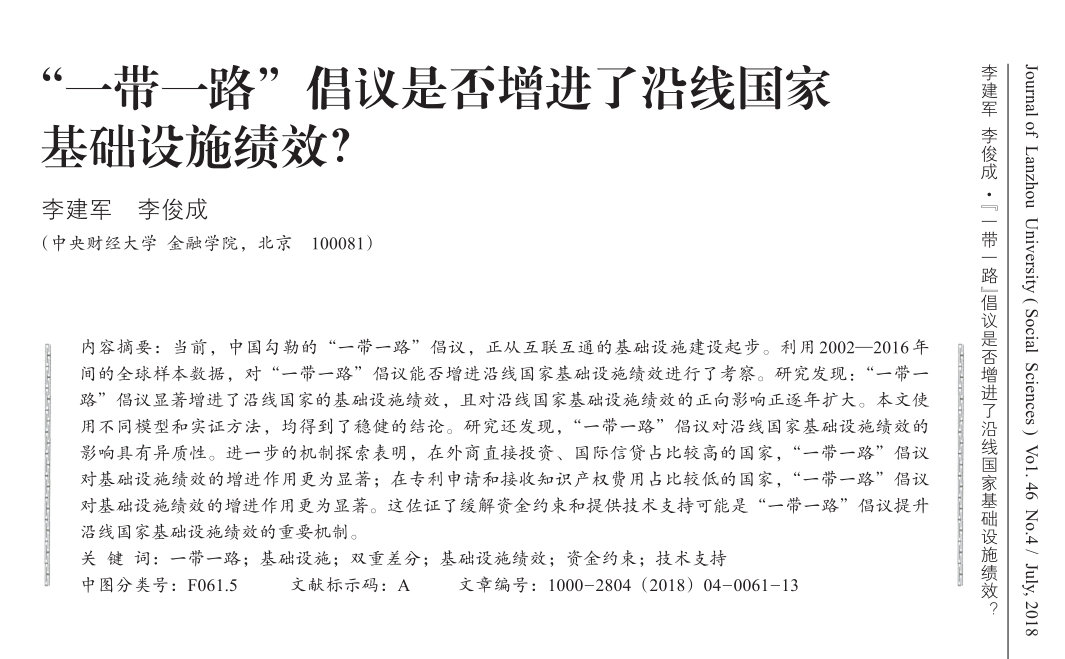 李建军:《“一带一路”倡议是否增进了沿线国家基础设施绩效?》