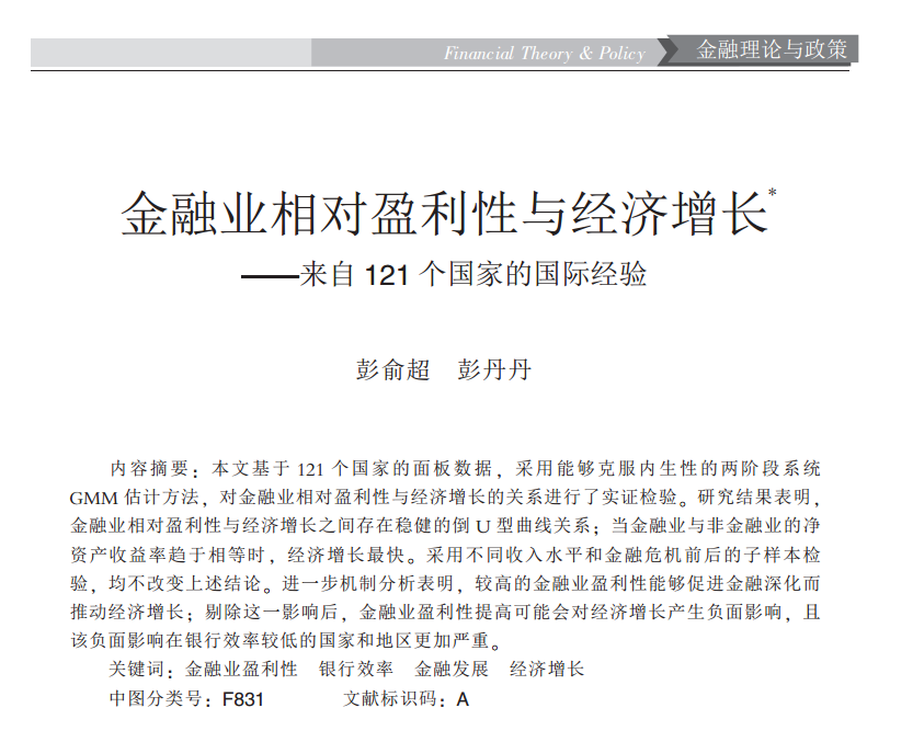 彭俞超:《金融业相对盈利性与经济增长——来自121个国家的国际经验》