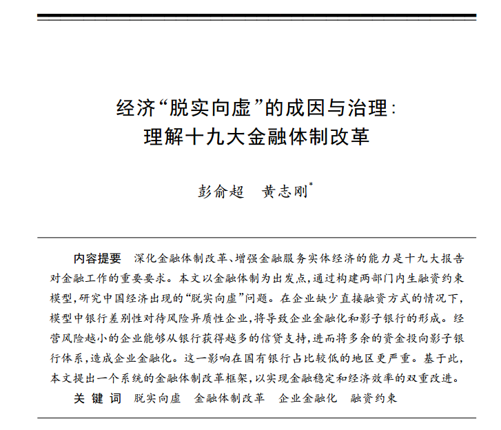 彭俞超、黄志刚:《经济“脱实向虚”的成因与治理:理解十九大深化金融体制改革》