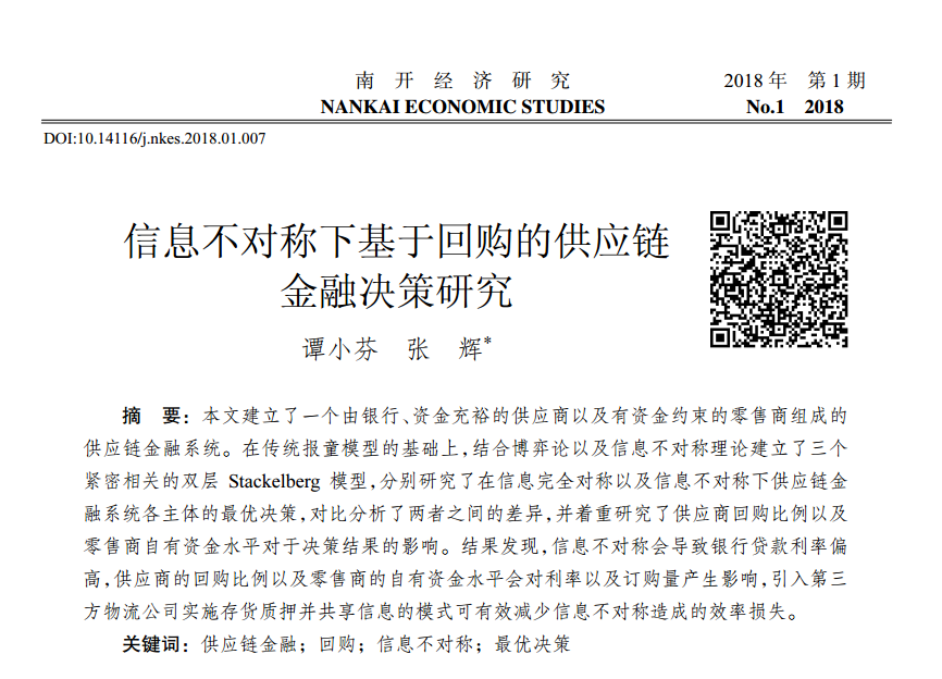 谭小芬:《信息不对称下基于回购的供应链金融决策研究》