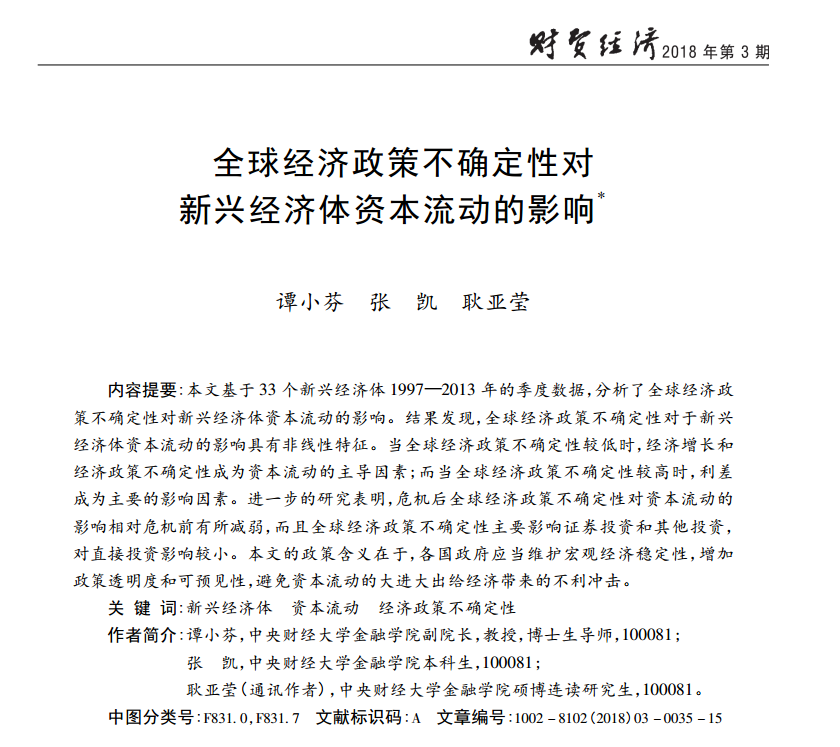 谭小芬:《全球经济政策不确定性对新兴经济体资本流动的影响》