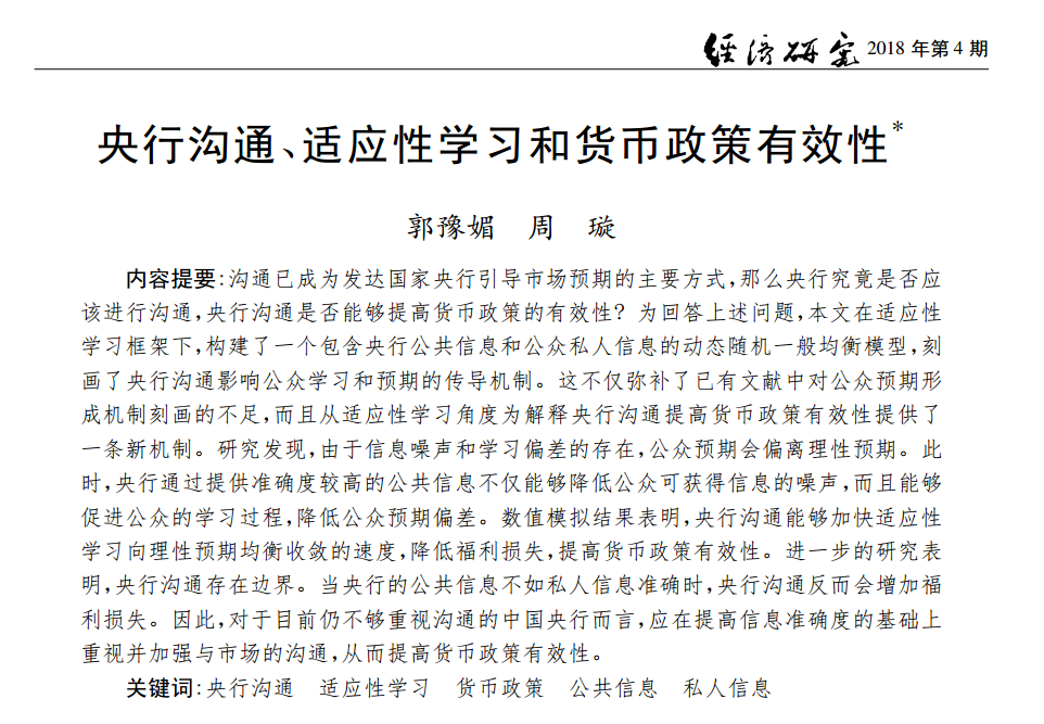 郭豫媚:《央行沟通、适应性学习和货币政策有效性》