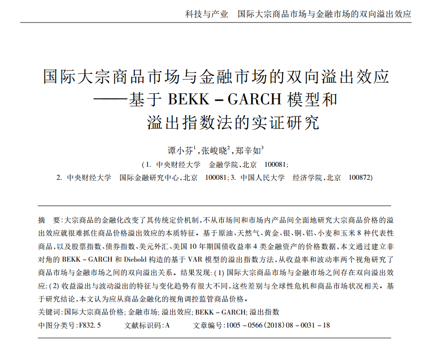 谭小芬:《国际大宗商品市场与金融市场的双向溢出效应——基于BEKK-GARCH模型和溢出指数法的实证研究》