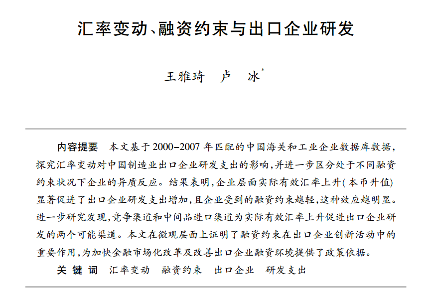 王雅琦:《汇率变动、融资约束与出口企业研发》
