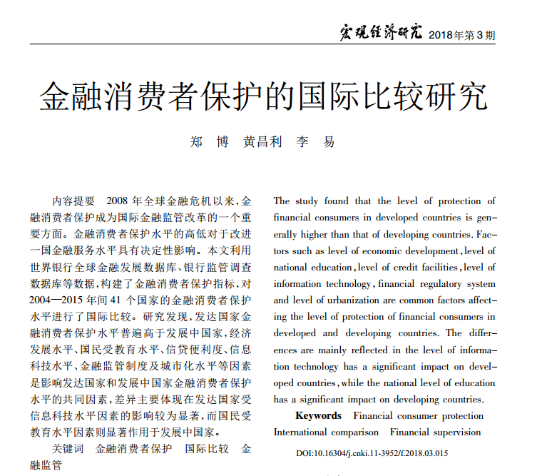 2008年全球金融危机以来,金融消费者保护成为国际金融监管改革的一个重要方面。金融消费者保护水平的高低对于改进一国金融服务水平具有决定性影响。本文利用世界银行全球金融发展数据库、银行监管调查数据库等数据,构建了金融消费者保护指标,对2004—2015年间41个国家的金融消费者保护水平进行了国际比较。研究发现,发达国家金融消费者保护水平普遍高于发展中国家,经济发展水平、国民受教育水平、信贷便利度、信息科技水平、金融监管制度及城市化水平等因素是影响发达国家和发展中国家金融消费者保护水平的共同因素,差异主要体现在发达国家受信息科技水平因素的影响较为显著,而国民受教育水平因素则显著作用于发展中国家。