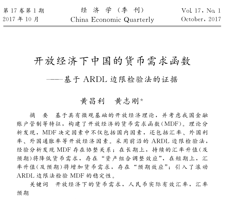 黄志刚、黄昌利:《开放经济下中国的货币需求函数——基于ARDL边限检验法的证据》