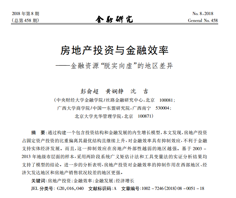 彭俞超:《房地产投资与金融效率——金融资源“脱实向虚”的地区差异》