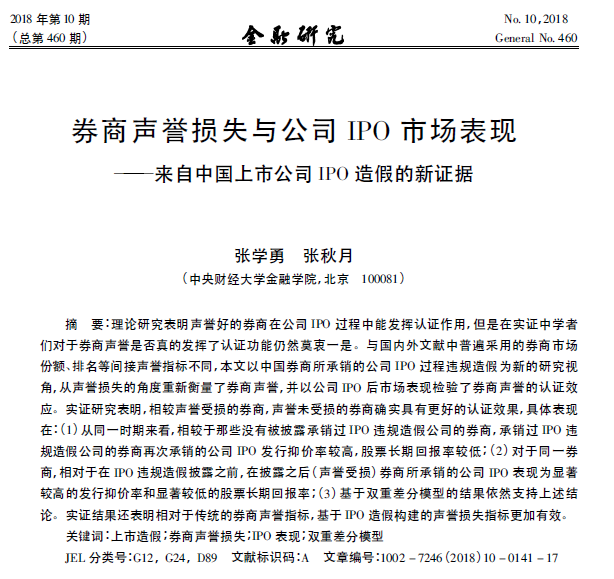 张学勇:《券商声誉损失与公司IPO市场表现——来自中国上市公司IPO造假的新证据》