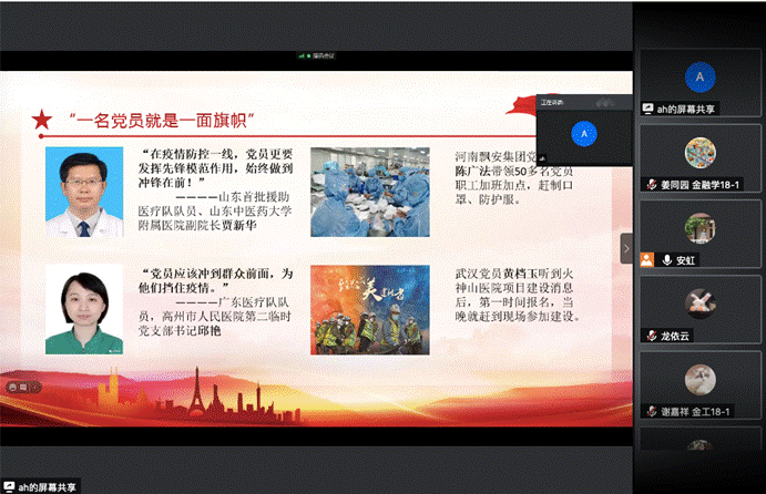 之后,毛老师结合新冠疫情的防控情况,指出我国是防控范围最广、速度最快的国家,这源于共产党人根植于初心和使命中的精神力量。并通过列举一个个疫情期间冲在第一线的鲜活事例和感人事迹,展现出“一名党员就是一面旗帜”,在国家最危险的时刻,党员不松劲,群众才更有信心。并强调了吃苦在前、享乐在后是共产党员的担当、责任和价值取向。