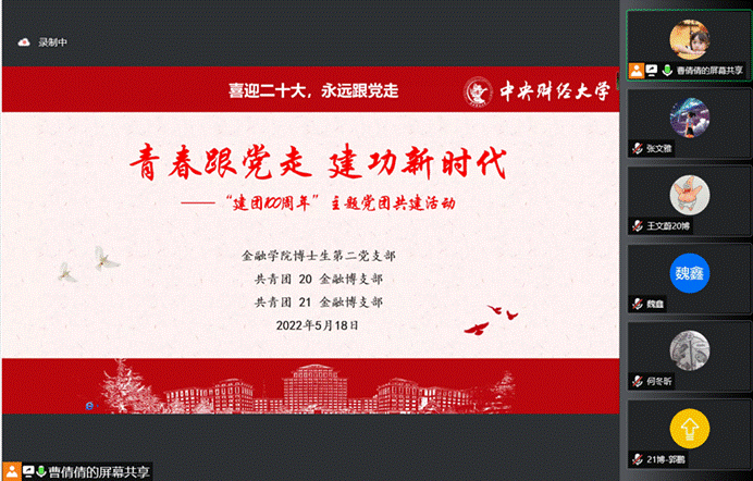 为了学习党的最新理论成果,贯彻落实党建带团建的制度机制,2022年5月18日下午14点,太阳集团tyc539博士生第二党支部、共青团20金融博支部和共青团21金融博支部联合举办“青春跟党走,建功新时代”主题党团共建活动,共40人参会。本次活动内容包括学习“习近平总书记在视察中国人民大学时的重要讲话”和“习近平总书记在庆祝共青团成立一百周年大会上的重要讲话”,并组织展开讨论。