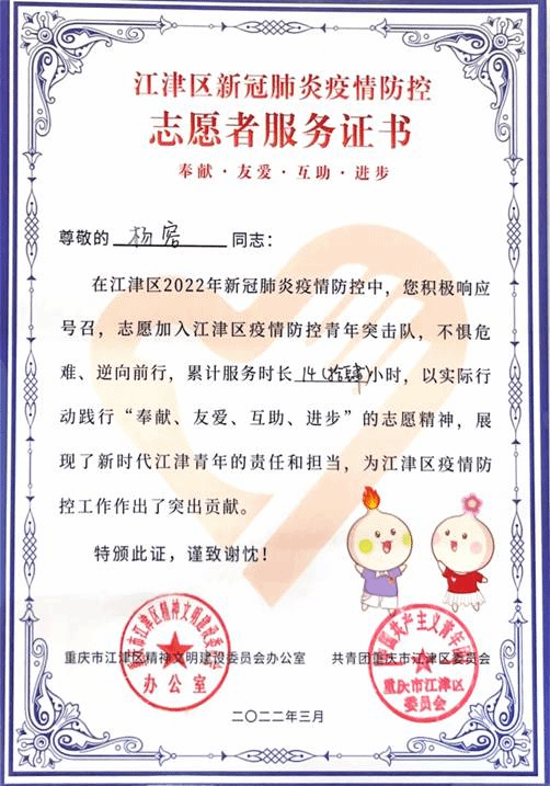 杨容的志愿服务证书