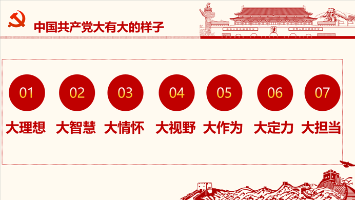 第二部分,张文雅同志从大理想、大智慧、大情怀、大视野、大作为、大定力、大担当7个方面详细介绍了中国共产党大有大的样子的具体体现。习近平总书记曾多次提到“中国共产党是世界上最大的政党,大就要有大的样子。”“大的样子”是对大国大党形象的朴素表达,“大样”,既是对中国共产党历史的总结,也是对今天和未来不断推进党的建设新的伟大工程的要求。这个大,不仅指党员人数和组织体系的超大规模,更重要的是体现在党的政治品格、组织塑造、领导智慧、精神境界等各方面。中国共产党一次次用实际行动向世界证明了中国共产党作为世界第一大党,大有大的样子,大有大的气质。