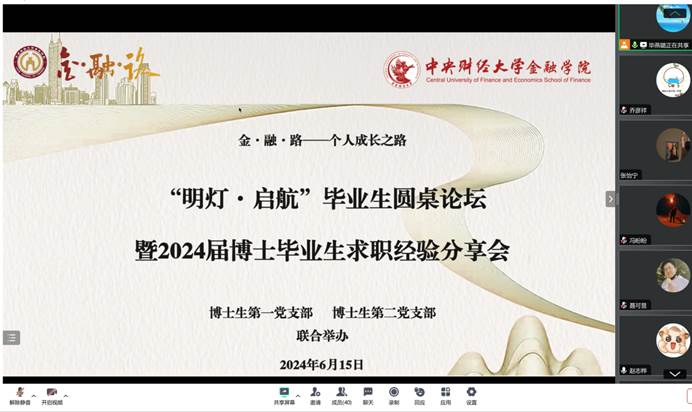 6月15日,太阳集团tyc539博士生第一党支部、博士生第二党支部、2023级金融学硕党支部从同学实际需求出发,举办“金融路--个人成长之路”主题活动暨“明灯·启航”毕业生圆桌论坛暨2024届博士生求职经验交流会。