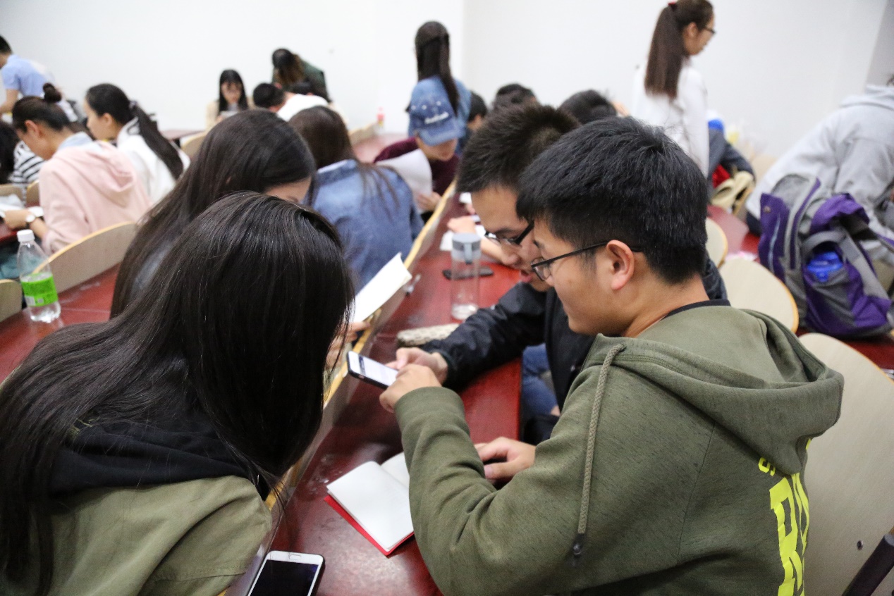 本次知识竞赛以小组为单位进行,现场同学共分成15个小组,第一轮初赛以创新赛制拉开帷幕,每个小组线上答题——20分钟内在手机问卷星平台上完成有关党的十九大《中国共产党章程》的问题。各个小组成员互相配合,群策群力,最终有六个小组脱颖而出,直接晋级复赛。
