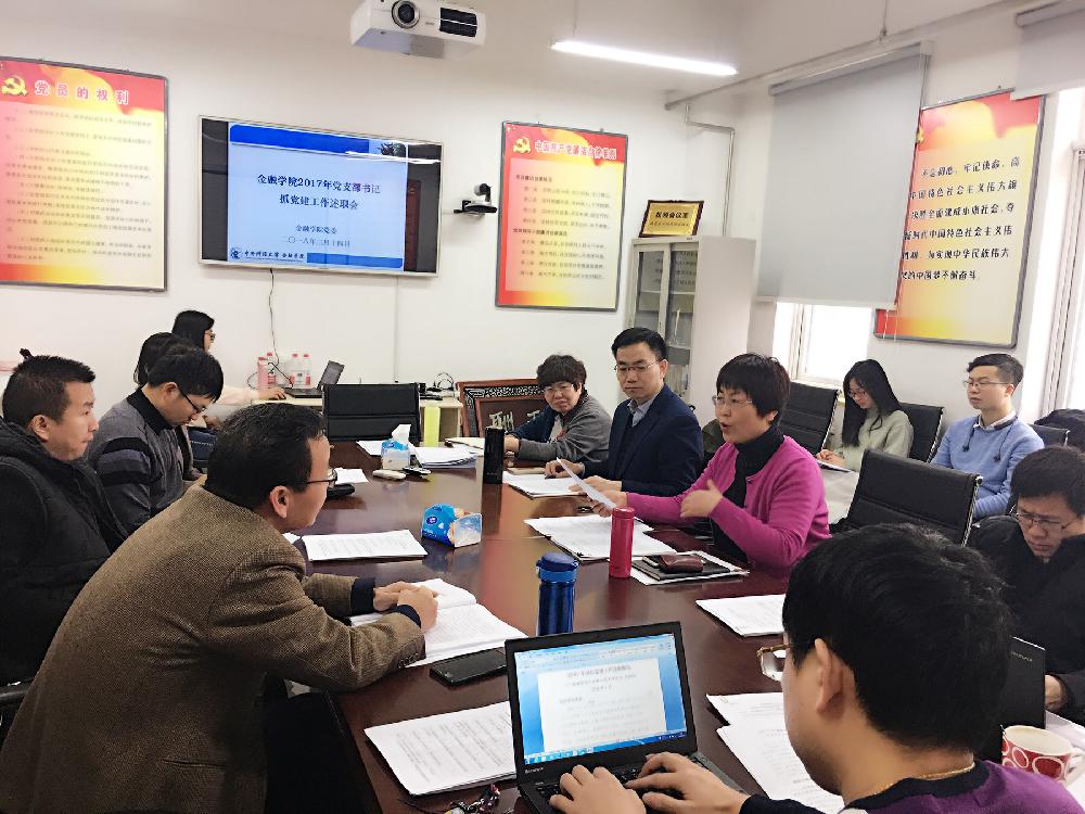 会上,应用金融系教工党支部书记韩复龄、国际金融系教工党支部陶坤玉、行政办公室教工党支部书记胡传雨、2015级研究生第一党支部书记祖鹏、2016级研究生第二党支部书记余嘉欣、2016级研究生第三党支部书记刘晓琳、2017级研究生第三党支部书记袁晖等7位同志重点围绕学习宣传贯彻党的十九大精神、贯彻全国和北京市高校思想政治工作会精神、落实基层党建重点任务、推动全面从严治党向基层延伸、抓党建促发展等内容,从作为党支部书记抓基层党建工作履职情况、存在的不足以及今后加强和改进工作的思路措施三个方面逐一述职。与会人员听取7位党支部书记述职后,现场填写了考核测评表。