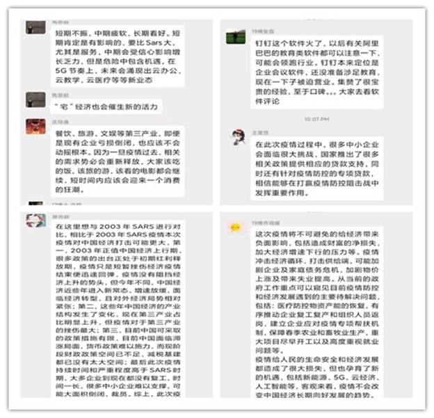 紧接着,支部展开疫情对我国经济相关影响的讨论,支部同志们各抒己见,畅所欲言。就宏观经济来看,有的同志认为长期来看,疫情不能动摇国内经济增长的趋势,而有的同志则与2003年SARS时期国情进行对比,认为国内经济可能受到疫情的重创。在产业结构层面,有的同志谈到,不同行业受疫情影响显著不同,服务业短期受挫严重,但疫情过后会,相应需求会得到释放,经济会回暖;有的同志认为,工业受到的影响可能更大,许多中小型工业可能会因为疫情被挤出产业链条。在新兴产业层面,有的同志谈到,受此次疫情的影响,5G,网络直播等“宅”经济会有更大的发展空间。而有关政策扶持上,同志们谈到疫情过后金融业应加大对中小企业的扶持以振兴经济。