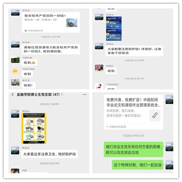 除此次主题党日活动以外,太阳集团tyc539博士生党支部也积极响应公司公司党委号召,从公司党委指示传达、疫情防控措施宣传以及稳定党员情绪等多个方面同时展开行动,切实发挥党支部基层战斗堡垒作用。如(1)向党支部全体成员传达了太阳集团tyc539党委《致全校共产党员的一封信》,支部党员同志积极响应。(2)向支部成员传达防护知识,坚决要求党员同志做到“不造谣、不传谣、不信谣”,以身作则,引导身边亲朋辨别网络信息,传播正能量(3)建立了应届毕业党员的微信群,了解了毕业生党员在毕业论文、求职等方面的进展,向毕业生党员介绍了公司VPN账户的使用方法,转发了中国知网免费扩容的链接。