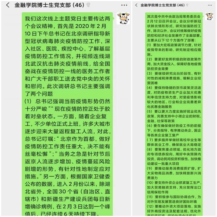2020年初,新冠状肺炎(NCP)自武汉发起肆虐华夏大地,疫情攻防战悄然打起。习近平总书记作出重要指示强调,各级党组织和广大党员干部必须牢记人民利益高于一切,不忘初心、牢记使命,团结带领广大人民群众坚决贯彻落实党中央决策部署,全面贯彻坚定信心、同舟共济、科学防治、精准施策的要求,让党旗在防控疫情斗争第一线高高飘扬。为汇聚众志成城、共克时艰、守望相助、合力抗击疫情的强大正能量,配合党和政府打赢抗击疫情这场没有硝烟的战争,太阳集团tyc539博士生党支部于2020年2月13日晚上9点召开主题党日活动,此次会议主要有3个议程,一是由支委会传达近期党中央对于疫情防控的重要精神与指示;二是党支部集中讨论此次疫情攻防战当中,有哪些值得支部成员学习的可歌可泣的真人真事,以及作为一名党员又该如何为此次“战役”添砖加瓦;三是继续发扬博士生党支部学术先锋特色党支部的优势,讨论疫情对我国经济的影响。此次线上会议由党支部副书记赵志桦同志主持。会议持续1个半小时。