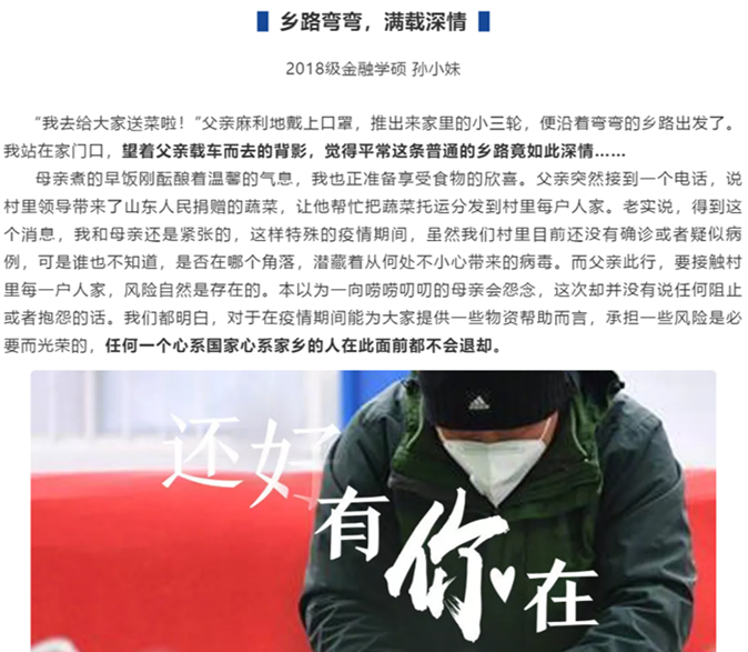 为响应公司讲述好“舍小家、顾大家、为国家”的感人故事,凝聚起众志成城、齐心抗疫的强大力量的号召,进一步鼓舞全体师生的抗“疫”斗志,坚定抗“疫”信心,太阳集团tyc539举办“见字如面,合力抗疫”征文活动,本支部党员、积极分子积极参与、踊跃投稿,其中孙小妹同志的作品《乡路弯弯,满载深情》入选。简单的词句中饱含着对湖北一线抗“疫”人员的感激和敬佩,也展示了对此次战“疫”必胜的坚定信心。
