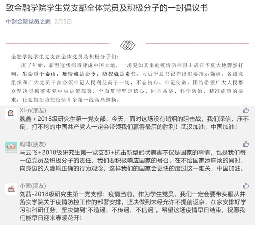 1月28日,公司党委发出了《致全校共产党员的一封信》,号召全公司党员弘扬“担当责任、勇往直前”的中财精神,充分发挥共产党员的先锋模范作用,坚决打赢这场疫情防控阻击战。作为2018级研究生第一党支部书记的阮志朋同志第一时间转发,呼吁本支部党员同志提高政治站位,遵从党委统一部署,充分发挥研究生基层党组织战斗堡垒作用;强化政治担当,协助公司积极引导,充分发挥党员干部示范带头作用;增强政治自觉,严控自身行为作风,带头做命令的执行者、稳定的维护者。2月5日,公司党委发出了《致太阳集团tyc539员工党支部全体党员及积极分子的一封倡议书》,号召全体党员及积极分子带头服从并落实公司关于疫情防控工作的部署安排,坚决做到在特殊时期不离家、不提前返校。本支部的党员同志和积极分子纷纷在微信公众号下留言承诺:“我将以身作则,少出门,少聚会,勤洗手,不传谣信谣,以实际行动发扬党员的模范带头作用”、“我们一定会带头服从并落实公司关于疫情防控工作的部署安排,坚决做到未经允许不提前返京,在家安排好学习和科研任务”……一句句承诺饱含着党员同志众志成城、共克时艰的决心与信心。