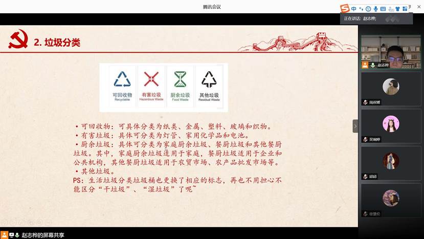 会议第二项,赵志桦同志根据5月1日起实施的新版《北京市生活垃圾管理条例》,就垃圾分类相关知识进行了相关介绍,并推荐大家合理利用现代互联网技术手段,学好垃圾分类,做好垃圾分类,在日后正式返校期间可以发挥出一名共产党员的先锋模范带头作用。