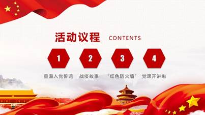 本次主题教育活动由支部宣传委员王丽梅同志主持,支部10名正式党员、1名发展对象、7名积极分子共同参与。本次主题教育活动包括四项:第一项为支部重温入党誓词;第二项为讲好支部战疫故事;第三项为党员“红色防火墙”活动总结;第四项为支部书记讲党课。