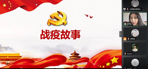 活动第二项,讲好支部战疫故事,首先,廖辉毅同志和江一帆同志作为党员代表,分别就自己的父亲和老师的故事进行分享,廖辉毅同志讲述了自己父亲在抗击疫情中,与其他村部的干部一起轮流值班、询问返乡人员体温等身体情况、连续三天陪护隔离人员等故事,充分体现关键时刻敢于担当、敢于付出的精神是值得我们学习与发扬的。江一帆同志则讲述了自己老师的故事,刘华老师平时的主要工作是在闸口以及车流中引导过闸口司乘人员在手机端进行防疫健康登记,并扫描查看车主与乘客的信息码了解是否来自或到过疫区,一旦发现入境人员信息码为红色,立马上报相关部门。其次,朱天泽同志作为积极分子代表,讲述各个小区居委会和社区居委会的故事,居委会党员干部就用铁丝固定做“栅栏”,贴上告知单,将开放式的农转非小区变成“封闭式小区”,组织党员员在农转非小区设立多个流动检测点,对进出人员作好登记和体温检测,体现了平凡人抗击疫情中的伟大。最后,沙尼亚同志作为发展对象代表,讲述了关于居民克热木大叔主动请缨报名参加天景华庭小区新冠肺炎联防联控志愿服务队的故事,体现了本次抗击疫情中各界平凡人的真挚抗疫,团结一心。于此同时,沙尼亚同志分享了发展对象培训班学习体会,坚定了加入中国共产党组织的决心,坚定了“永远跟党走,决心不动摇”的信念。