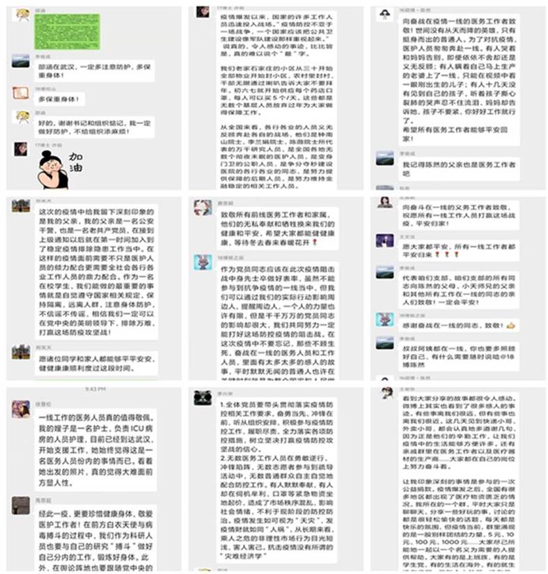 (1)疫情初期及时向支部成员传达疫情防护知识。2020年1月20日,支部书记李俊成同志在疫情暴发初期就觉察到新冠肺炎的传播,其于当日向支部成员科普口罩种类选择的相关知识,随后在春节期间也积极向支部成员传达人民日报等权威媒体的防护知识,提醒支部同志要加强防护,保持健康的身心,共同抗击疫情!同时,坚决要求党员同志做到“不造谣、不传谣、不信谣”,以身作则,引导身边亲朋辨别网络信息,传播正能量。