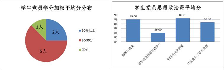 入党积极分子课程通过率为99.56%,学分加权平均分88分以上的有9人,最高为94.93分,平均学分绩点3.6以上的有11人,最高为4.27,各思想政治课的平均分均高于86分。
