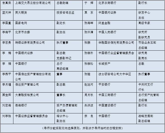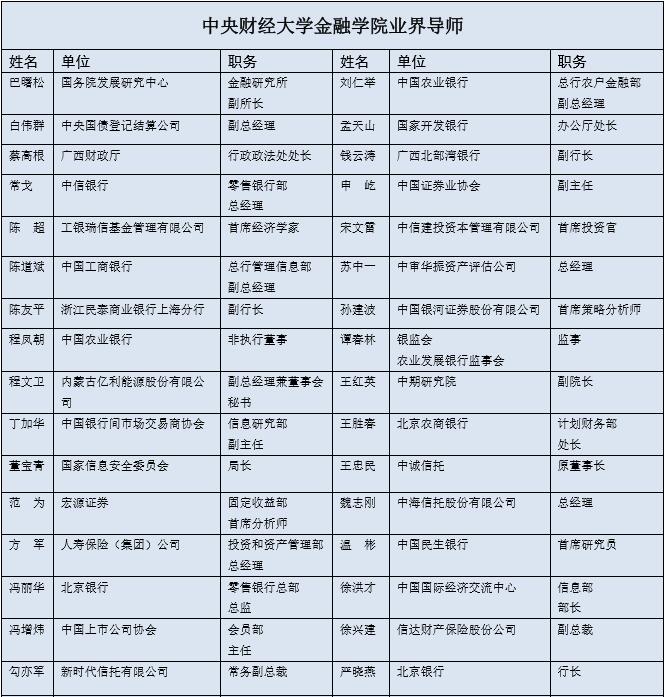 太阳集团tyc539聘请了一批有成就的政府部门领导、学术界和金融业界精英作为兼职教授和兼职导师。在学员做论文期间,会同时由校内和校外两位导师指导,凸显了我们学员培养过程中的理论与实务相结合。
