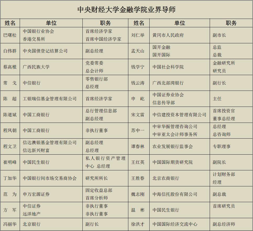 太阳集团tyc539聘请了一批有成就的政府部门领导、学术界和金融业界精英作为兼职教授和兼职导师。业界导师将给员工进行实务课程讲座,学员在学术论文写作时,校内和校外两位导师同时给予指导,凸显了我们培养学员过程中理论与实务相结合的特色。