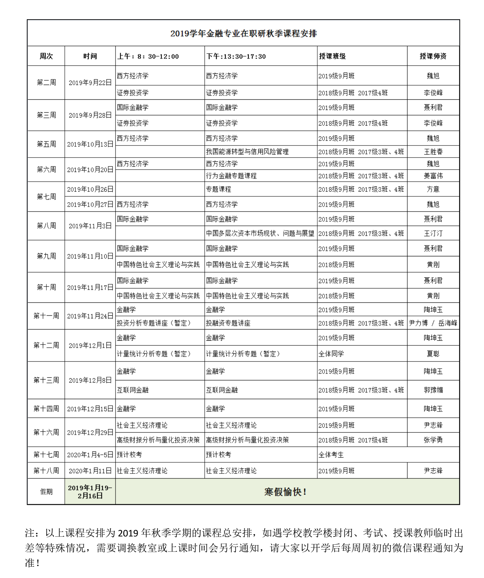 2019学年金融专业在职高级研修班秋季课程安排