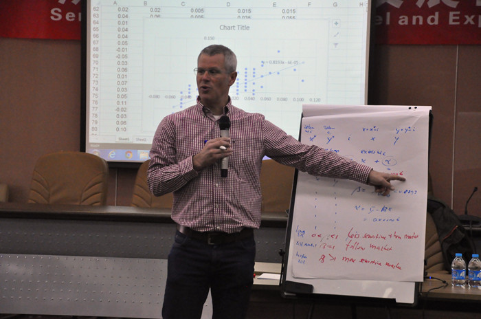 12月20日至21日,Hamers教授的课程再深入介绍了诸如矩回归、固定效应等计量方法后,集中用详实的数据向大家展示了资产定价模型的构建原理。这一过程中,每一位同学都与教授进行了一对一的交流,一步一步完成了教授布置的数十个小练习。同学们表示课程的操作性很强,他们都能循序渐进地掌握不同方法的核心思想。21日下午,教授简单介绍了数据分类等实证金融方法,让大家获益匪浅。