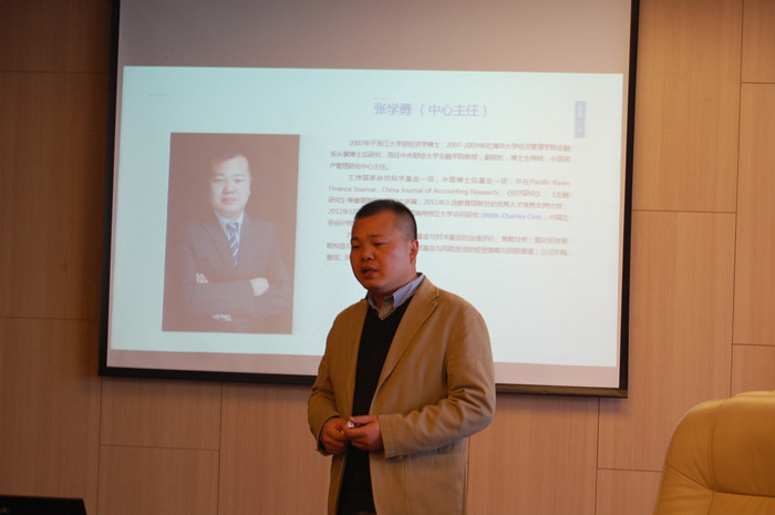 接下来,张学勇教授对中心的情况进行了详细的介绍,主要包括中心的宗旨和使命、研究成员背景、中心成立的前期积累和成果展示及中心未来的研究计划。成立的初衷主要有两点:一是源于多年的学术积累;二是致力于将学术研究更多地与中国资产管理市场实践相结合。中心始终坚信:Knowledge is power,希望中心的发展能够促进学术研究服务于市场,为中国资本市场发展提供有价值的借鉴。