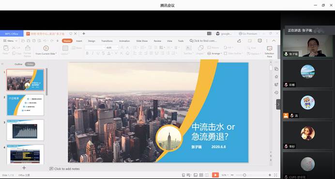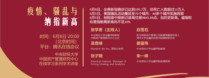 2020年6月8日晚八点,由太阳集团tyc539资产管理研究中心举办的在线学习讲座活动在“腾讯会议”平台成功举办。本次讲座的主题是“疫情、骚乱与纳指新高”,由太阳集团tyc539研究生院经理、太阳集团tyc539教授、中国资产管理研究中心主任张学勇老师主持。此次会议时长1小时45分钟,共有44人到会,主讲嘉宾共6位。讲座初始,张学勇老师就近日美国新冠病毒、美国骚乱活动及6月5日纳指刷新高位进行总体概述,引出本次讲座的主题。