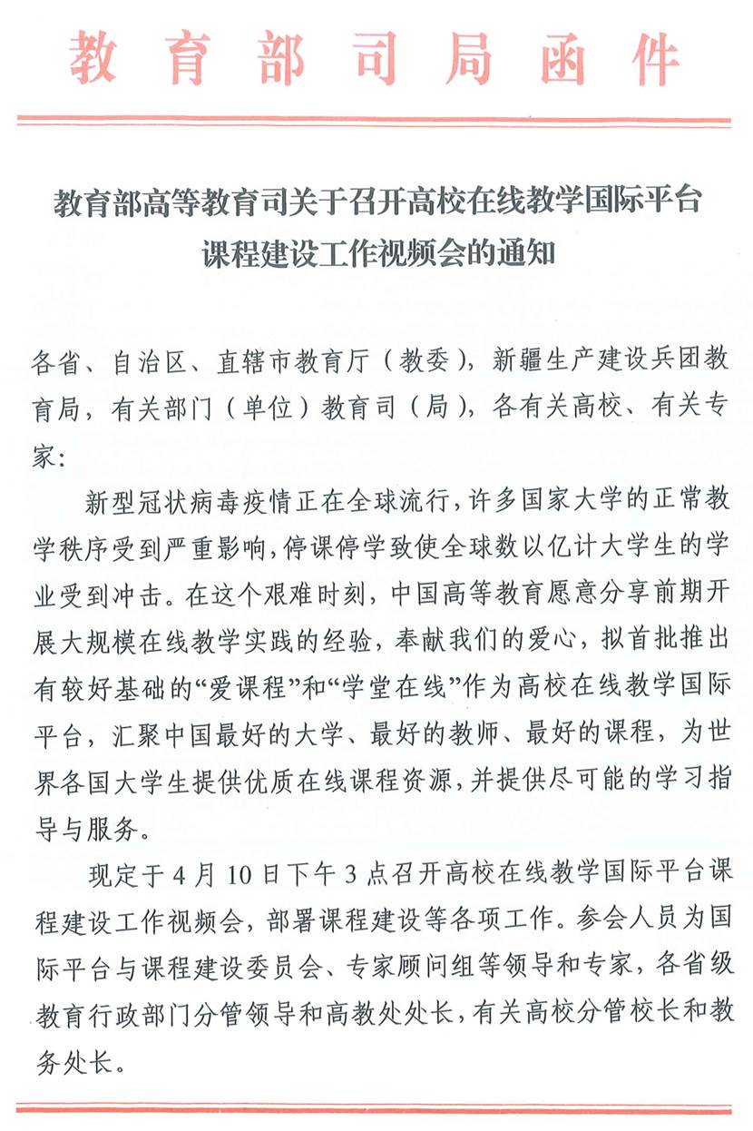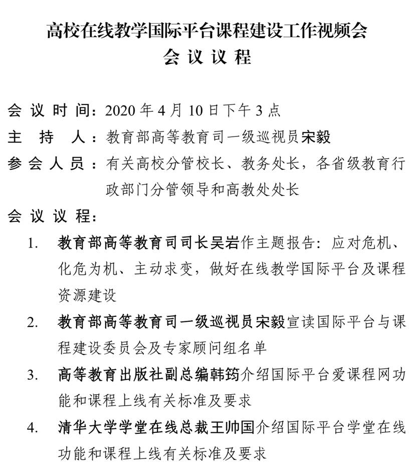 教育部高等教育司关于召开高校在线教学国际平台课程建设工作视频会的通知