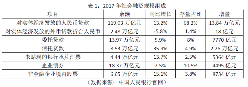 1. 2018年1月12日,中国人民银行公布2017年度社会融资规模报告。初步统计,2017年社会融资规模存量为174.64万亿元,同比增长12%。2017年社会融资规模增量累计为19.44万亿元,比上年多1.63万亿元。12月份社会融资规模增量为1.14万亿元,比上年同期少4999亿元。具体组成数据如表1所示。