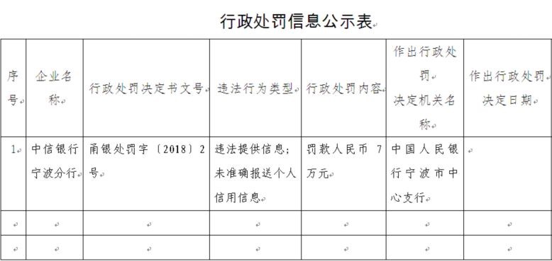 3. 2018年4月19日,中国人民银行宁波市中心支行网站发布行政处罚信息显示,中信银行宁波分行涉违法提供信息及未准确报送个人信用信息两项违规,中国人民银行宁波市中心支行对其罚款人民币7万元。
