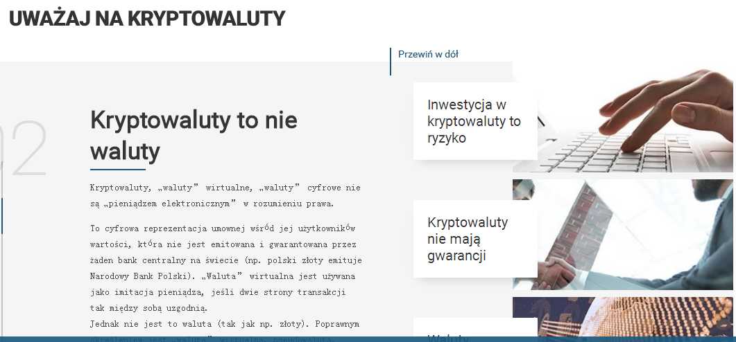 1. 波兰央行——波兰国家银行(NBP)宣布推出了一个全新网站,旨在提醒该国国民注意加密数字货币风险。该网站网址为“https://uwazajnakryptowaluty.pl/”,网站名称翻译过来就是“小心加密数字货币”。在波兰央行新网站首页上,还专门写了一条信息:“虚拟货币不是货币”。同时,他们还做出了详细解释:“加密数字货币、虚拟货币、以及其他数字代币都不是现有法律框架下的‘电子货币’。”
