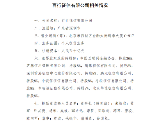 公示显示,百行征信有限公司股东由中国互联网金融协会和芝麻信用、腾讯征信、深圳前海征信、鹏元征信等8家征信公司组成。其中中国互金协会持股36%,8家征信平台各持股8%。朱焕启拟任董事长兼总裁,朱焕启现任汇达资产托管有限责任公司董事长,曾就职于中国人民银行。
