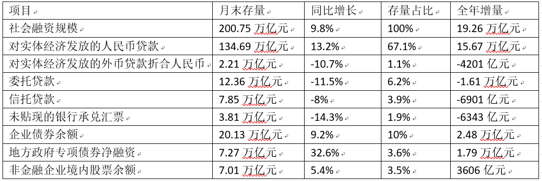 1.2019年1月15日,中国人民银行发布2018年社会融资规模数据,具体如表1所示。