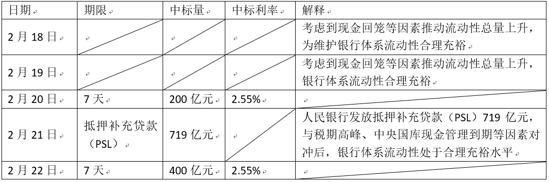 3.2019年2月18日到2月22日,人民银行进行了多笔公开市场业务操作,具体表1所示。