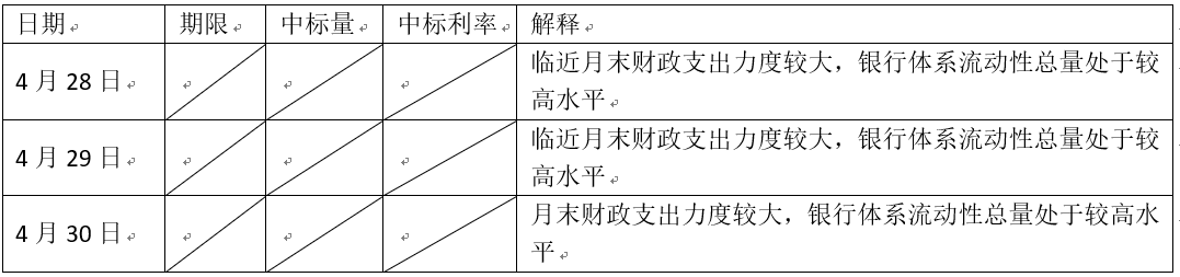 4.2019年4月28日到4月30日,人民银行未进行公开市场业务操作,具体表1所示。