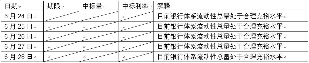 3.2019年6月24日到6月28日,人民银行未进行公开市场业务操作,具体表1所示。
